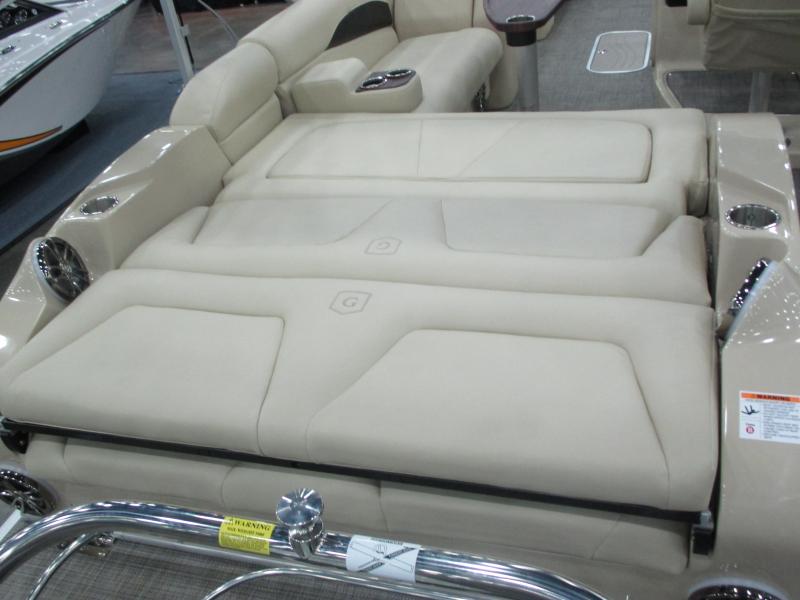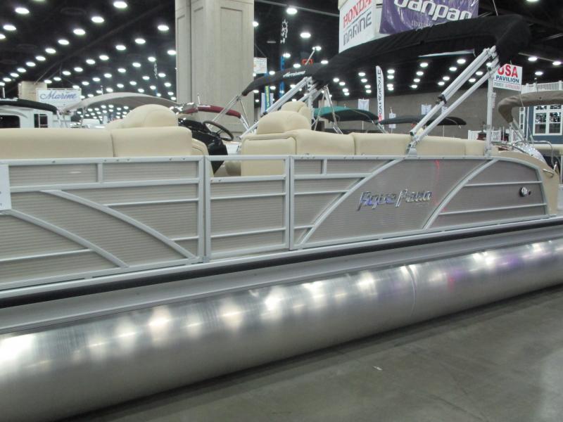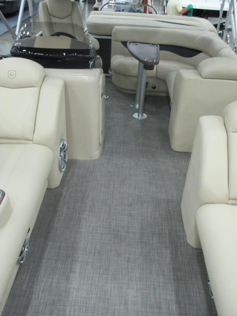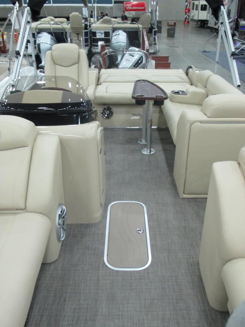 (taupe)- AP Upgrade (stainless steel, rubrail with inserts, Elite 3X color fish finder, underseat lights), corner castings polished stainless steel with lights and cleats, removable cupholders, Metro Gray Seagrass flooring, Seagrass for helm, hourmeter, Quick Release fender locks, ski tow bar, stereo upgrade, in floor storage, Tripletoon Package (underdeck skin, lifting strakes, inside skirting, power assist steering), trailer
